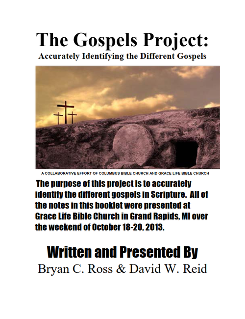 The purpose of this project is to accurately identify the different gospels in scripture. All of the notes in this booklet were presented at Grace Life Bible Church in Grand Rapids, MI over the weekend of October 18-20, 2013 and is a collaborative effort of David Reid of Columbus Bible Church and Bryan Ross of Grace Life Bible Church. Download | Watch